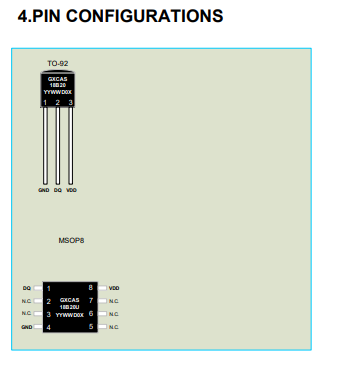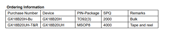 The GX18B20H digital thermometer provides 9-bit to 12-bit Celsius temperature measurements and has an alarm function with nonvolatile user- programmable upper and lower trigger points. The GX18B20H communicates over a 1-Wire bus that by definition requires only one data line (and ground) for communication with a central microprocessor. It has an operating temperature range of -55° C to +125° C and is accurate to ±0.1°C over the range of 0° C to +50° C. In addition, the GX18B20H can derive power directly from the data line (“parasite power”), eliminating the need for an external power supply. Each GX18B20H has a unique 64-bit serial code, which allows multiple GX18B20Hs to function on the same 1-Wire bus. Thus, it is simple to use one microprocessor to control many GX18B20Hs distributed over a large area. Applications that can benefit from this feature include HVAC environmental controls, temperature monitoring systems inside buildings,