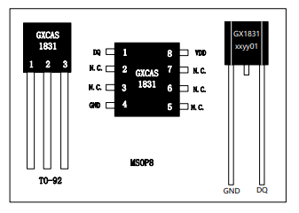 The GX1831 digital thermometer provides temperature measurement with a 12 bit resolution and can achieve lower and upper temperature limit alarms through programmable non-volatile storage units. GX1831 uses a single bus protocol to communicate with the upper computer, requiring only one signal line and one ground line. Its temperature measurement range is -55 ℃~+125 ℃. The testing accuracy within the range of -10 ℃ to+70 ℃ can reach ± 0.4 ℃. In addition, it can also operate in parasitic mode, directly supplying power to the chip through signal lines without the need for additional power supply. Each GX1831 has a 64 bit serial number, which allows multiple GX1831s to be connected in series on the same single bus for networking. With just one processor, multiple GX1831s distributed over a large area can be controlled. This networking method is particularly suitable for HVAC environmental control, building, equipment, grain temperature measurement, industrial temperature measurement, and process monitoring and control applications.