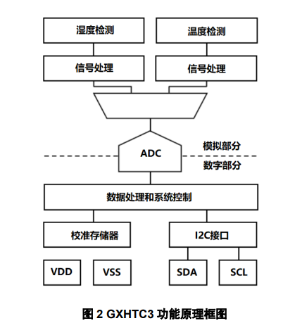 GXHTC3是一款为消费电子应用领域设计的温湿度传感器芯片。它在封装体积、功耗、供电电压范围和性价比方面完全满足消费电子领域需求。GXHTC3在单颗芯片上实现了完整的温湿度传感器系统,包括电容式湿敏传感单元,PN结测温单元,16位ADC,数字信号处理电路,校准数据存储单元和I²C数字通信接口电路。