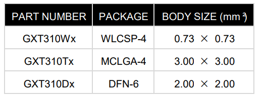 | GXT310Wx-T&R | GXT310Wx | WLCSP-4 | 3000 | Tape & Reel |