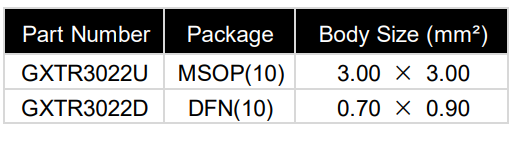 | GXTR3022AU-T&R | GXTR3022AU | MSOP-10 | 3000 | Tape & Reel |