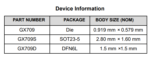 The GX709 is available in a 5-pin, SOT-23 package and 6-pin, DFN6L package