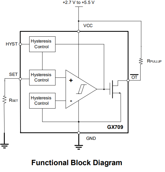 The GX709 is a fully-integrated, resistor-programmable temperature switch with a temperature threshold that is set by just one external resistor within the entire operating range. The TMP709 provides an open-drain, active-low output and has a 2.7V to 5.5V supply-voltage range.