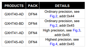 | GXHT40-AD-R2-T&R | GXHT40-AD | DFN-4 | 2000 | Ordinary precision, addr:0x44, Tape & Reel |