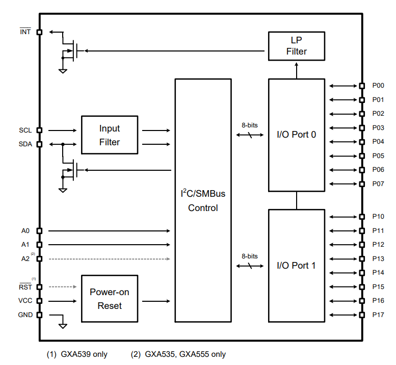 The GXA535 series is used to expand general-purpose input/output ports (GPIO). Port data is transmitted through the standard two-wire I2C protocol, which can support a maximum communication rate of 1MHz (up to 2MHz when high-speed mode is enabled).