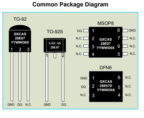 GX28E07 is an EEPROM that communicates with the host using a standard single bus protocol and has a storage capacity of 1024 bits. Composed of four memory pages with 256 bits per page. The data is first written into an 8-byte register, verified to be correct, and then copied to EEPROM memory. Its characteristic is that the four memory pages are independent of each other and can be individually set to write protect or EPROM emulation mode. In EPROM storage mode, the state of all bits can only change from 1 to 0. GX28E07 communicates through a 1-Wire bus. The communication adopts the standard 1-Wire protocol. Each device has an unchangeable 64 bit ROM address code, which is written into the chip by factory lithography. In a multi-point 1-Wire network environment, this address code is used to address devices.
