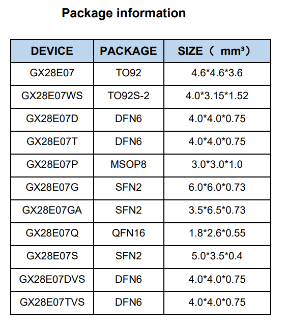 | GX28E07GA-T&R | GX28E07GA | SFN2(3.5*6.5) | 4000 | Tape & Reel |