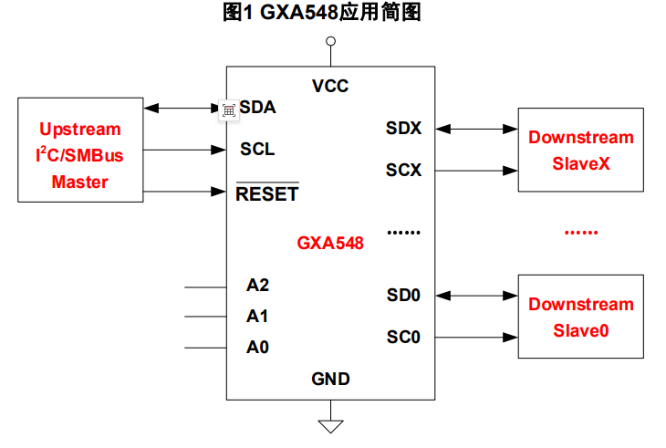 GXA548 是一款通过 I2C 总线控制的 8 通道双向数据传输开关芯片。上游主机通过芯片的 SCL、SDA引脚选通某个或某多个下游从机,并进行指定的数据传输。GXA548 支持选通任意组合的下游通道从机。