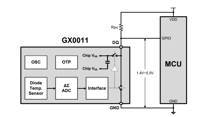 GX0011是一款全集成数字式温度传感器,无需任何外部感温单元即可实现12位(0.0625℃)温度输出。