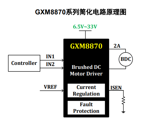 GXM8870 具有集成电流调节功能,该功能基于模拟输入 VREF 以及 ISEN 引脚的电压(与流经外部电阻的电流成正比)。该器件能够将电流限制在某一水平,显著降低功耗。