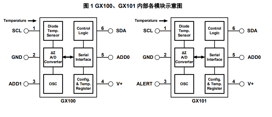 GX100、GX101是两款高精度、低功耗、可替代NTC / PTC热敏电阻的数字温度传感器,可用于通信、 计算机、消费类电子、环境、工业和仪器仪表应用中的 温度测量。GX100、GX101在-40°C至+125°C的正常工 作范围内,可提供≤±0.5°C的温度精度,并具有良好的 温度线性度。 GX100、GX101的额定工作电压范围为2.7~5.5V, 在温度转换中静态工作电流低于40μA。集成在芯片内部 的12位ADC分辨率低至0.0625°C。 GX100、GX101采用2.9mm×1.6mm的SOT-23(6)封装,兼容SMBus和I 2C接口,具有SMBus报警功能。