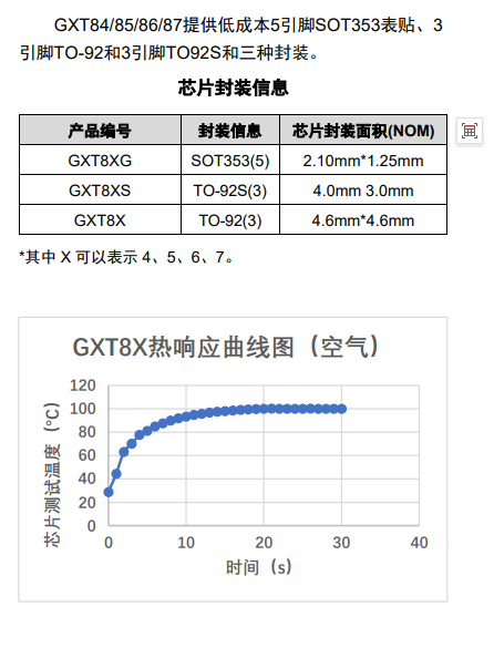 GXT84/85/86/87(后面GXT8X只这四款芯片)具有较低输出阻抗、线性输出、出厂校准,所以可极大简化温度控制电路和ADC的需求。该系列传感器件均可采用1.5 V至5.5 V的单电源供电。电源电流低于10μA,自热效应非常小,在静止空气中小于0.1°C。
